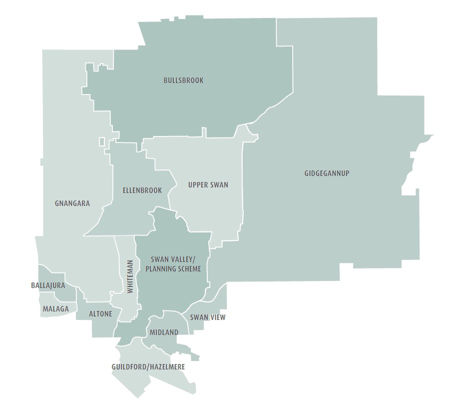 The Upper Swan Local Area is located in the City's north and includes the suburbs of Upper Swan, Bullsbrook, Brigadoon, Baskerville and Walyunga National Park.